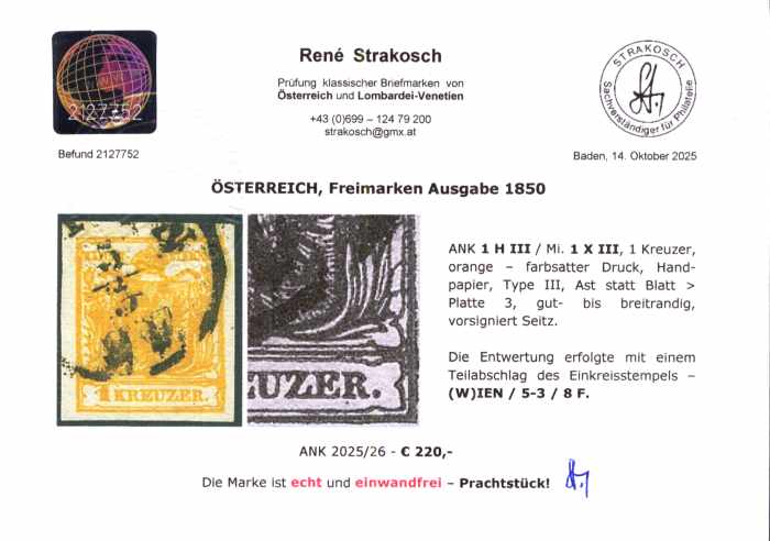 1 kr, wappen, handpapier, type b/III, orange, prachtstück, signiert SEITZ, fotoattest