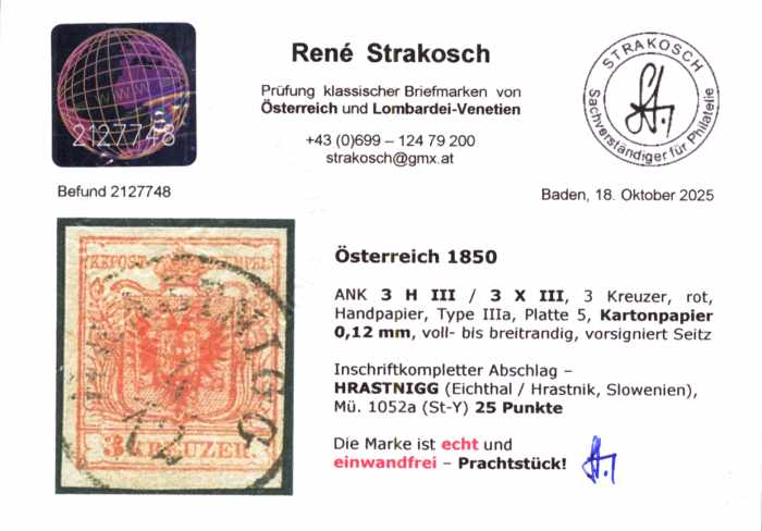3 kr, wappen, handpapier, kartonpapier 0,12 mm, Müller 1052a - 25 punkte, prachtstück, signiert SEITZ, fotoattest