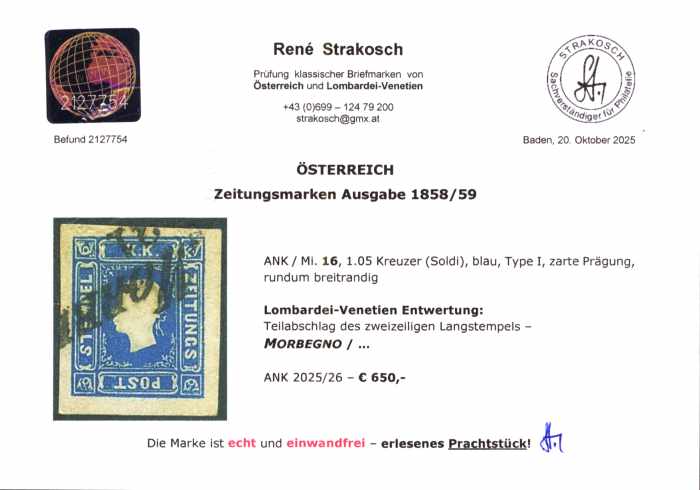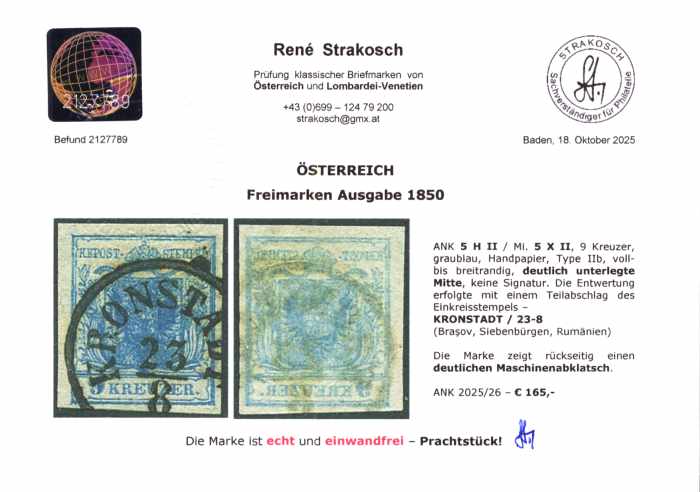 5 kr, wappen, handpapier, type IIb, dunkelblau, unterlegte mitte, plattenfehler rahmenbruch oberhalb "ER" von kreuzer, zarter maschinenabklatsch, fotoattest