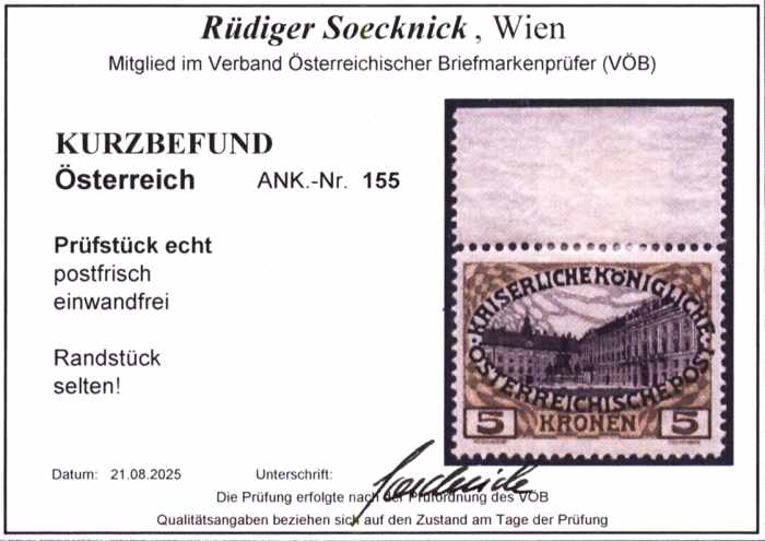 5 kr, wappen, handpapier, type I, blau, mit deutlichem maschinenabklatsch und randdruck rechts, fotoattest