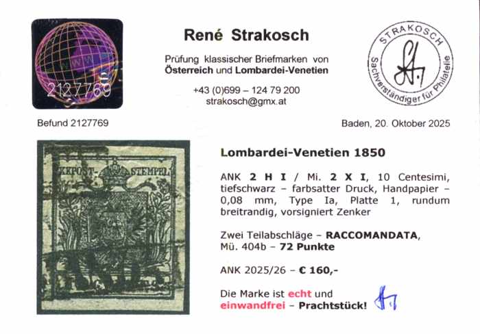 lombardei-v., 2 so, KFJ, type I, freimarke 1858, fotoattest